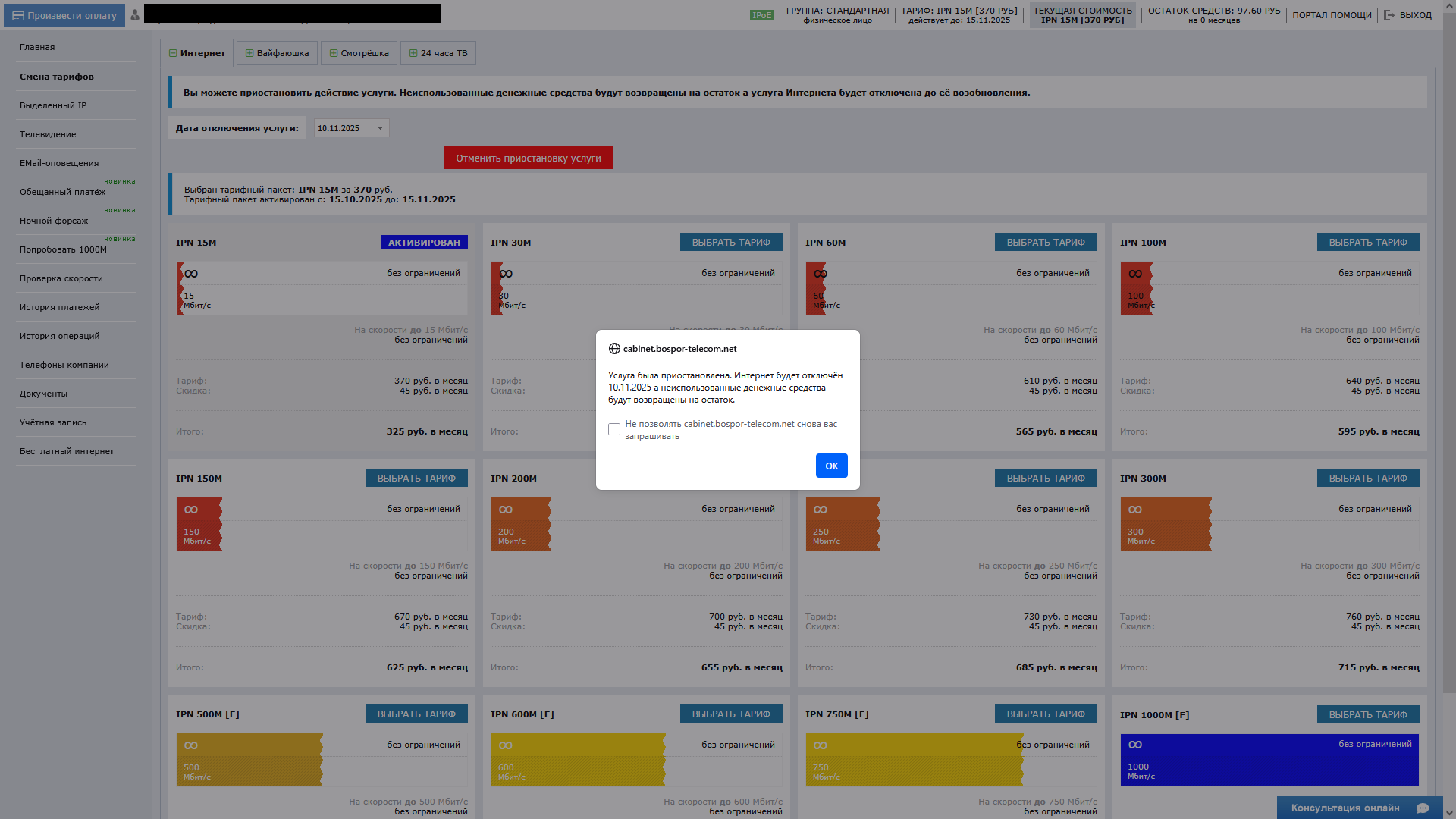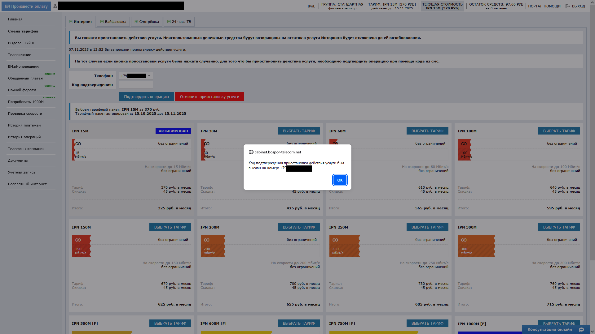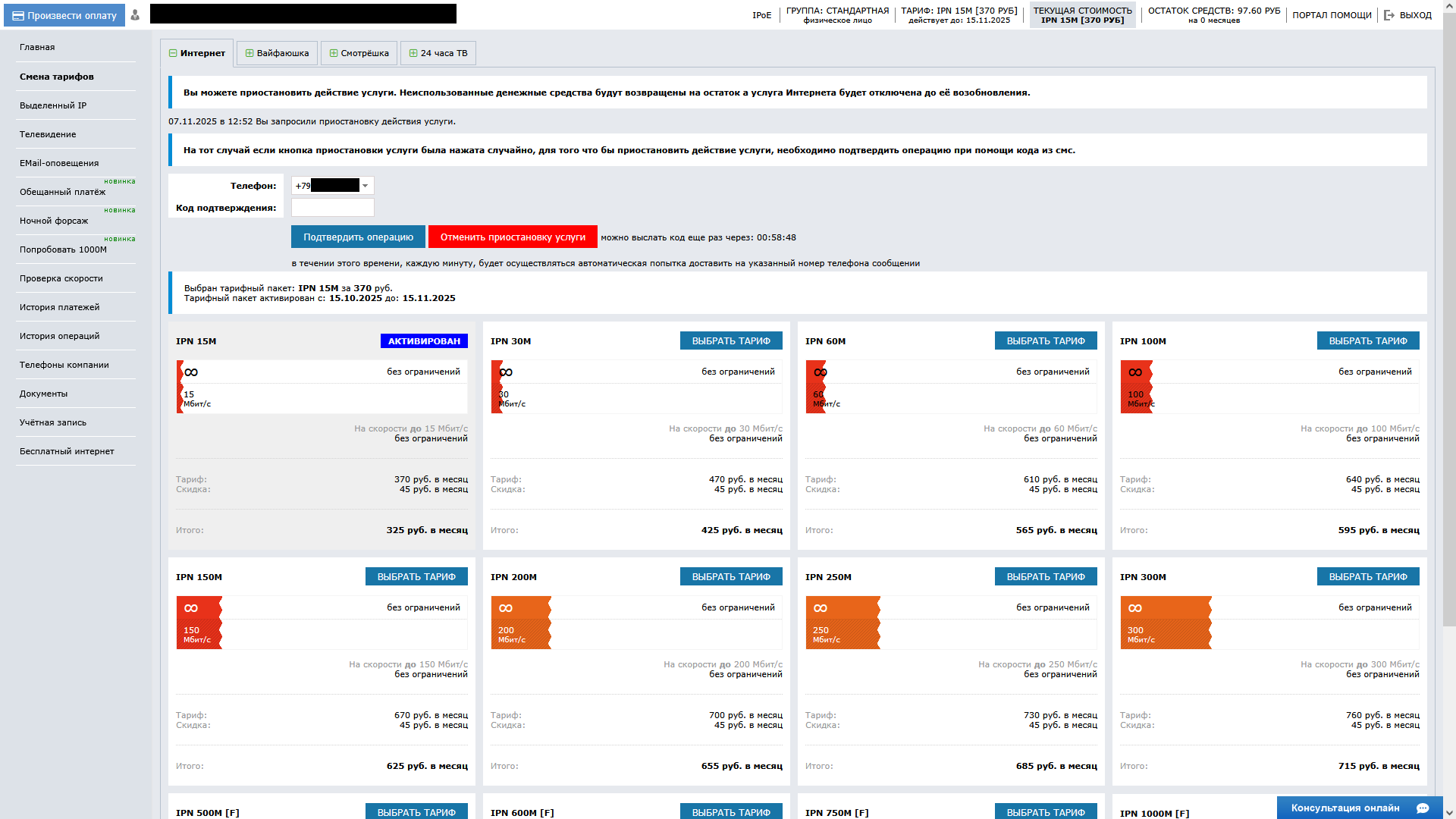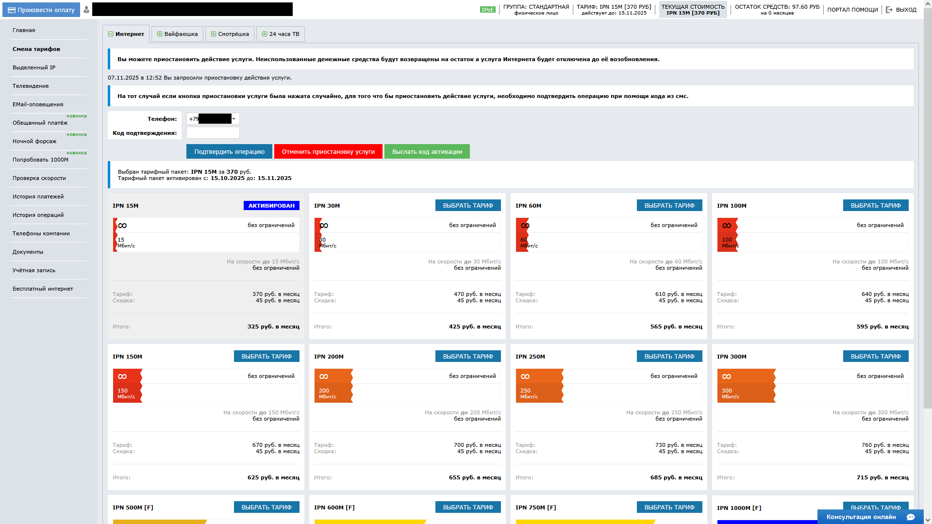 Приостановить услугу можно в разделе смены тарифов. ![]() Для приостановки услуги Интернет необходимо нажать левой клавишей мыши на кнопке "Приостановить услугу". ![]() Во избежание случаев случайного нажатия кнопки приостановки услуги или нажатия детьми, необходимо подтвердить операцию кодом из СМС который отправляется после нажатия левой клавишей мыши на кнопке "Выслать код активации". ![]() Если на указанный номер телефона не пришло СМС-сообщение с кодом подтверждения, его можно узнать позвонив по одному из наших номеров в службу технической поддержки с номера телефона на который отправлялось СМС-сообщение. ![]() После получения кода подтверждения его необходимо ввести в поле "Код подтерждения" и нажать левой клавишей мыши на кнопке "Подтвердить операцию". ![]() После успешного ввода кода подтверждения необходимо выбрать дату отключения услуги и нажать левой клавишей мыши на кнопке "Приостановить услугу".
