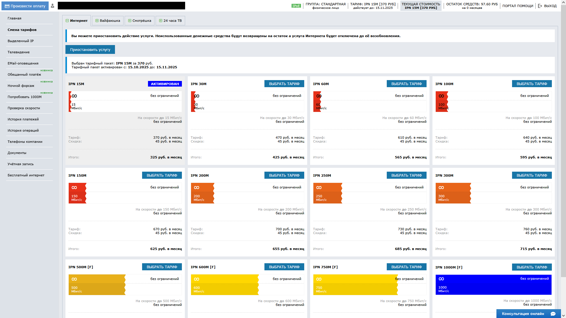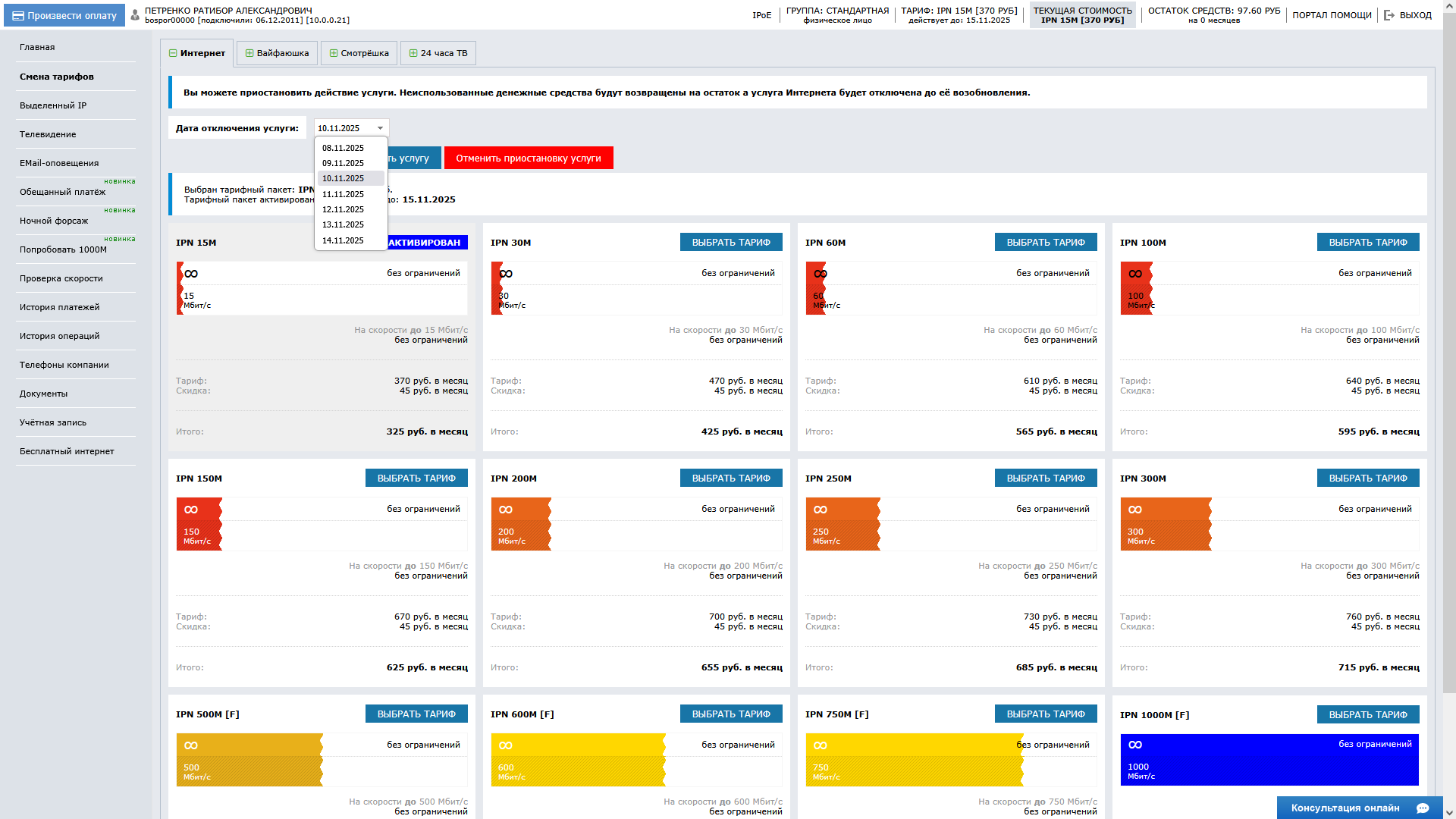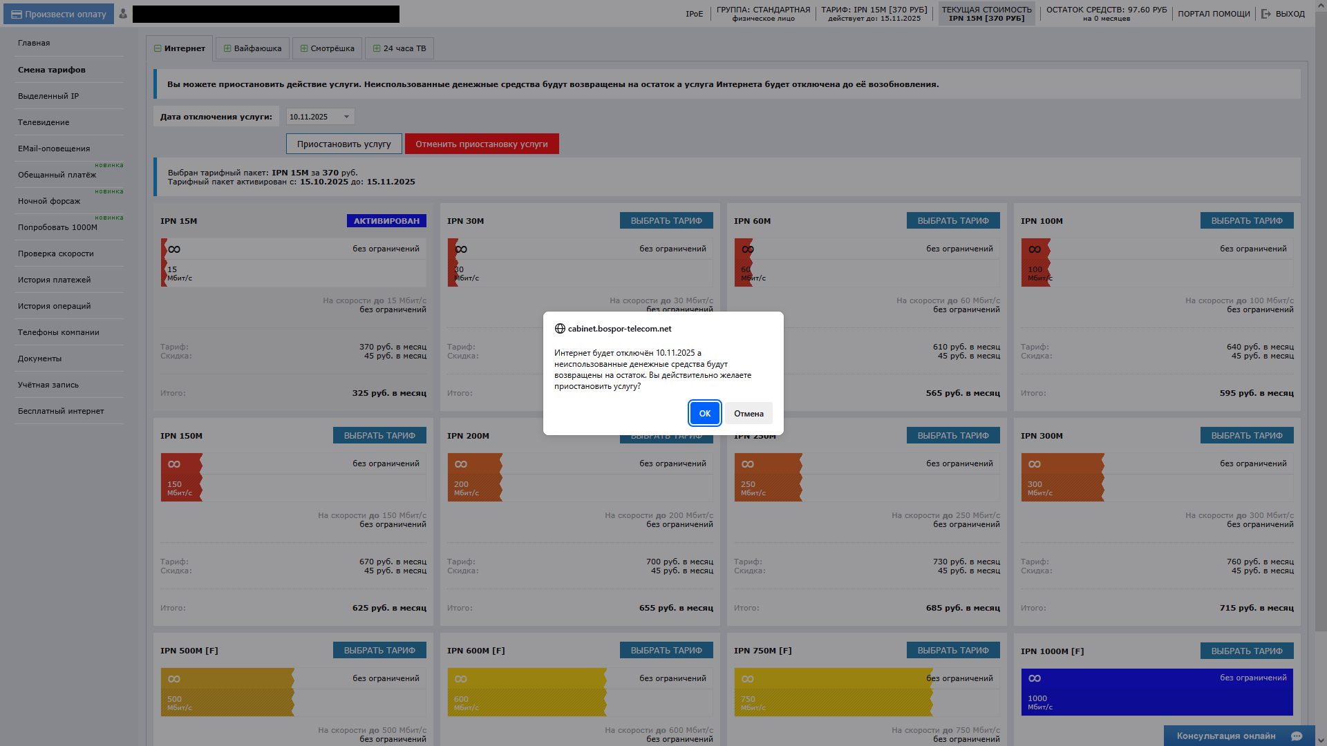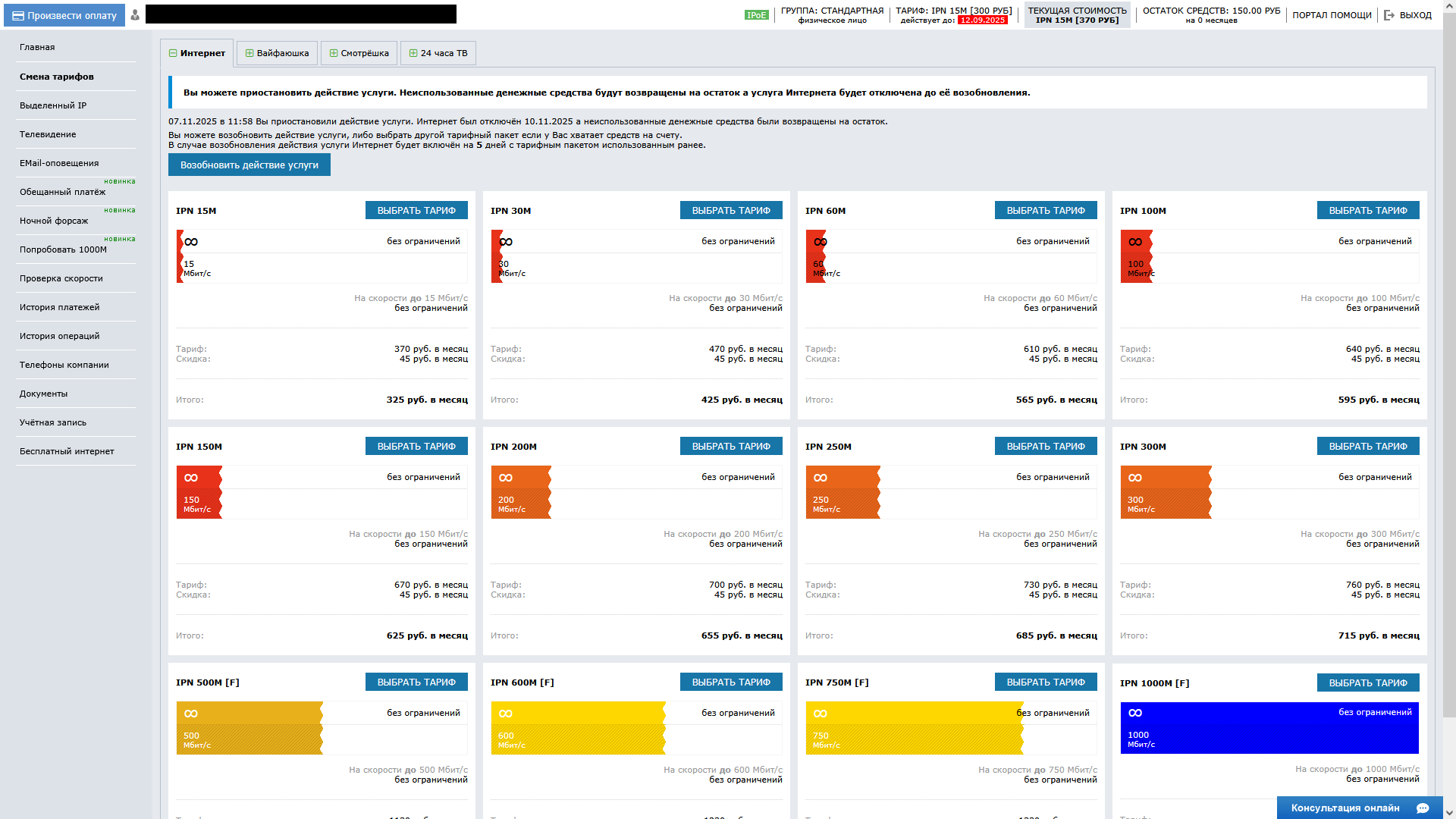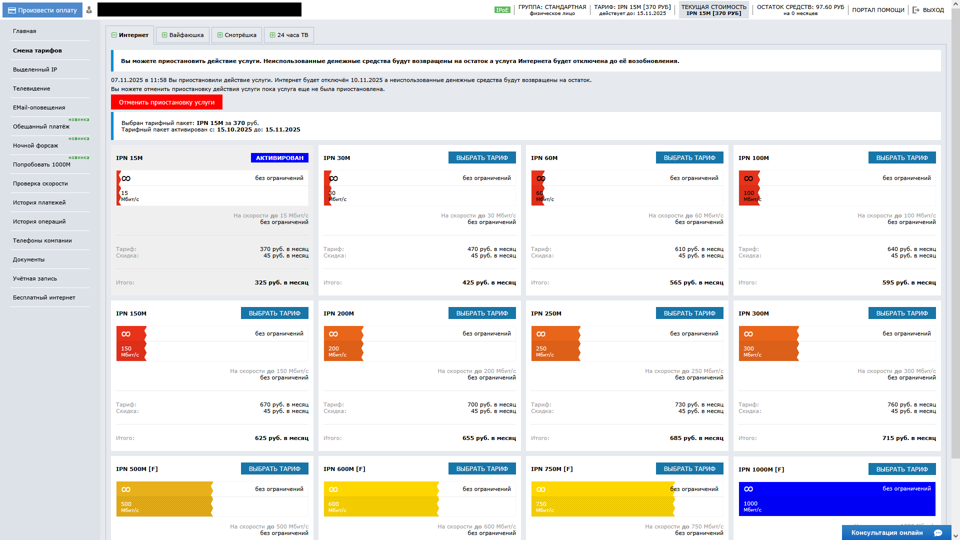 Приостановить услугу можно в разделе смены тарифов. ![]() Для приостановки услуги Интернет необходимо нажать левой клавишей мыши на кнопке "Приостановить услугу". ![]() Во избежание случаев случайного нажатия кнопки приостановки услуги или нажатия детьми, необходимо подтвердить операцию кодом из СМС который отправляется после нажатия левой клавишей мыши на кнопке "Выслать код активации". ![]() Если на указанный номер телефона не пришло СМС-сообщение с кодом подтверждения, его можно узнать позвонив по одному из наших номеров в службу технической поддержки с номера телефона на который отправлялось СМС-сообщение. ![]() После получения кода подтверждения его необходимо ввести в поле "Код подтерждения" и нажать левой клавишей мыши на кнопке "Подтвердить операцию". ![]() После успешного ввода кода подтверждения необходимо выбрать дату отключения услуги и нажать левой клавишей мыши на кнопке "Приостановить услугу".