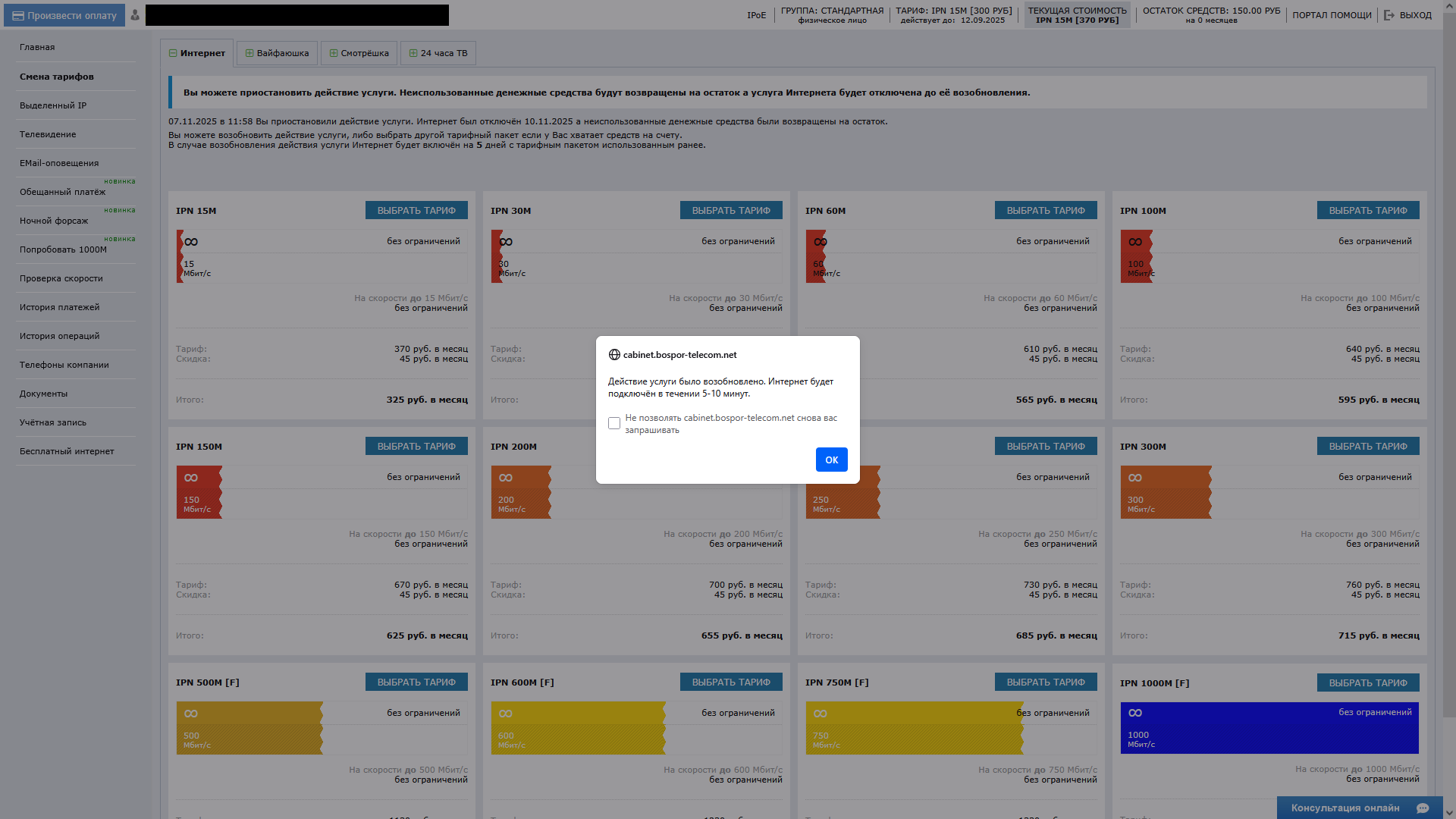Услугу можно в любой из дней начиная с завтрашнего дня и заканчивая последним днём действия тарифного пакета. ![]() Во избежание ошибочного выбора даты отключения услуги после нажатия левой клавишей мыши на кнопке приостановки услуги появится окно подтверждения операции. ![]() После подтверждения выбора даты отключения услуги появится сообщение о том что услуга была приостановлена. ![]() До момента отключения Интернета после приостановки действия услуги можно отменить приостановку услуги. ![]() Когда возникнет необходимость в возобновлении доступа в Интернет, то услугу можно возобновить нажатием левой клавишей мыши на кнопке "Возобновить действие услуги".